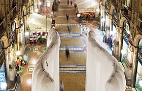 Desde Milán hasta el cielo: el avión inflable gigante que inauguró la apertura de la línea M4 del metro que conecta el centro de la ciudad con el aeropuerto de Linate. 20 metros de largo se suspendió en el aire a 8 metros de altura en famosa y céntrica Plaza San Babila.